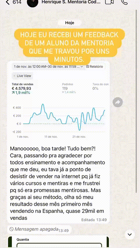 Aulas gravadas onde vocĂȘ aprende o passo a passo para fazer sua primeira venda em euro com COD. Ao entrar, vocĂȘ recebe acesso completo Ă s aulas de pesquisa de produto, criação de loja, criativos, trĂĄfego pago, fornecedor e acompanhamento semanais ao vivo.